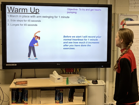 Georgie designed a cardiovascular workout for her family in which she had to draft a plan, invite everyone to join in and then ask them to evaluate her routine. She shared her findings with the class via a slide show and we tried out some of the exercises. |