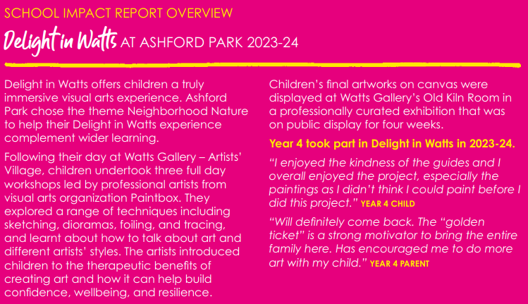 In 2024, Year 4 pupils participated in The Delight in Watts immersive art experience. Please click on the image below to see the impact report.