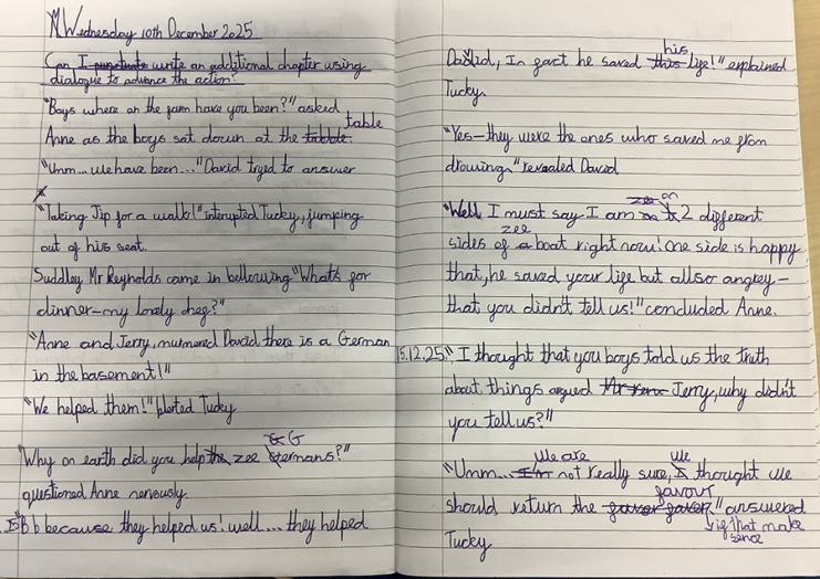 Poppy wrote a lively and engaging additional chapter to our class text- Friend or Foe by Michael Morpurgo. She used dialogue to advance the action and edited her work independently. |